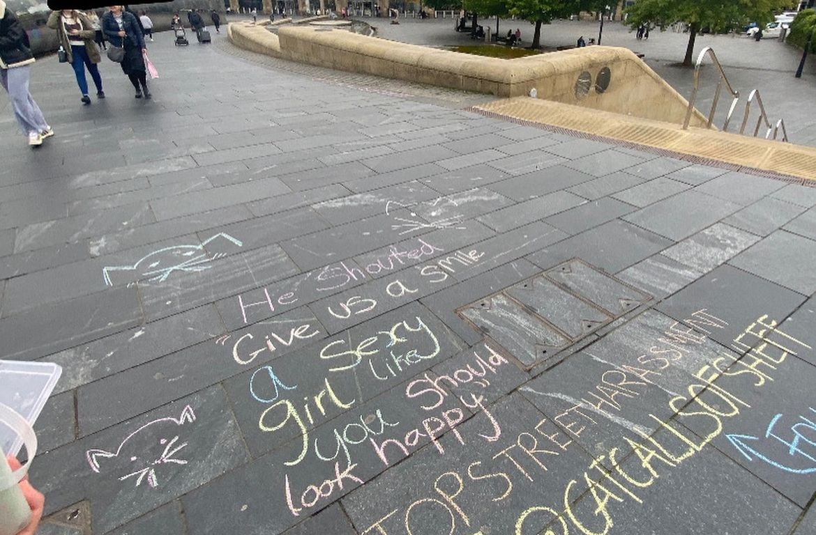 Catcalls of Sheffield runs as one part of the global collective of Catcalls accounts, which are all affiliated with the Chalk Back movement which began in New York in 2016. Each group tailors its campaign towards the needs of its city. Catcalls of Sheffield receive reports of harassment here in Sheffield and chalk the details on the sites where they happened.